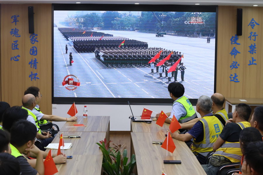 2025年9月3日上午,上海市静安区工人文化宫(北宫)项目工地上,中建八局三十多名管理者和工友在会议室集中收看阅兵直播。