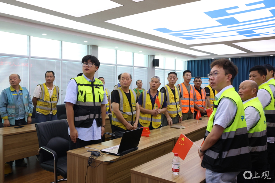 工友们和现场节奏一致,在升国旗环节起身行注目礼,唱国歌。