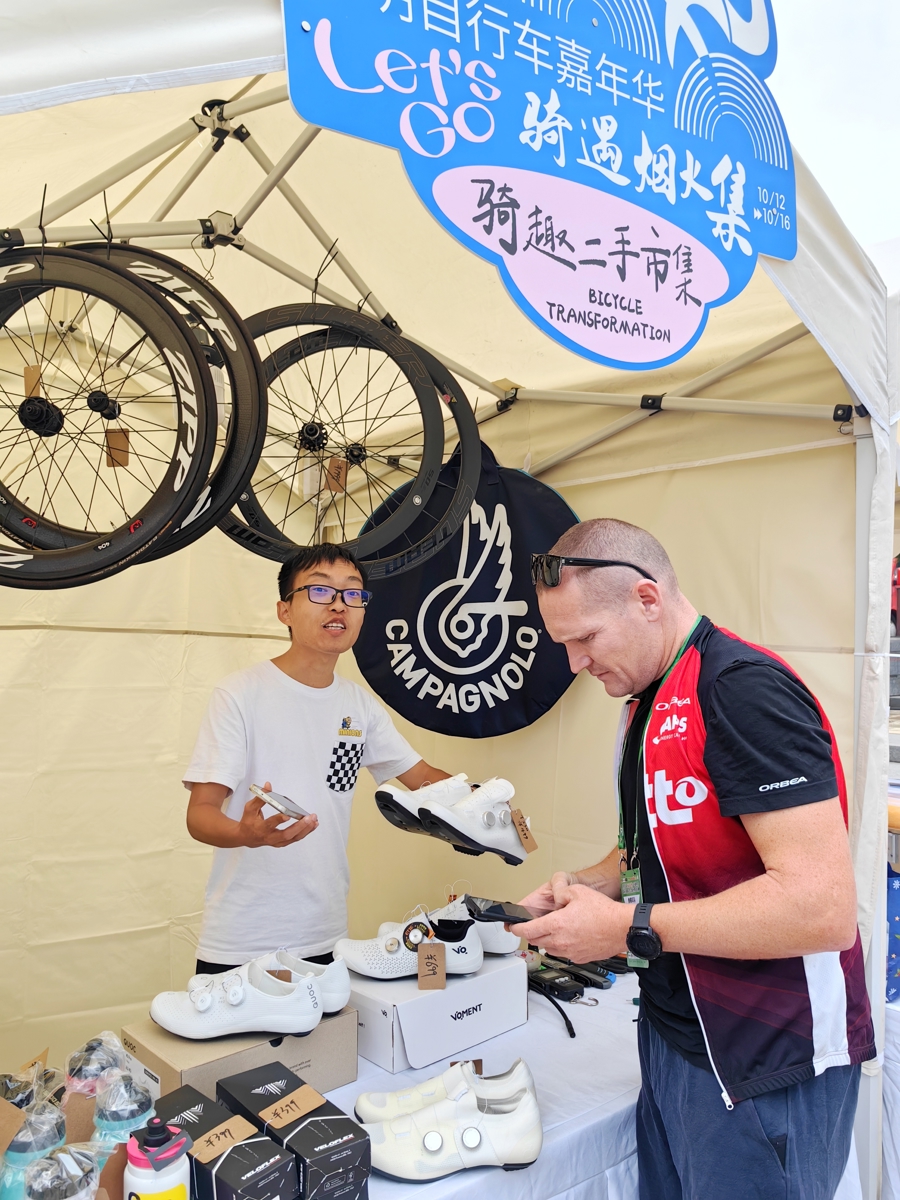 他的摊位上,物件摆得满满当当:从锃亮的车架、轮组,到成套的骑行套件,再到护具、锁鞋、速干骑行服等,人身与车身装备一应俱全。想得周到的他,还特意备了维修工具,免费给车友做简易维修、给自行车打气。最让他兴奋的是10月14日晚上举行的二手拍卖会,他带来的五件“轻奢”拍品全部成交,有现役世界冠军同款UAE水壶、东京奥运冠军同款EF水壶,还有现役世巡赛车手苏浩钰同款的XDS-阿斯塔纳水壶。