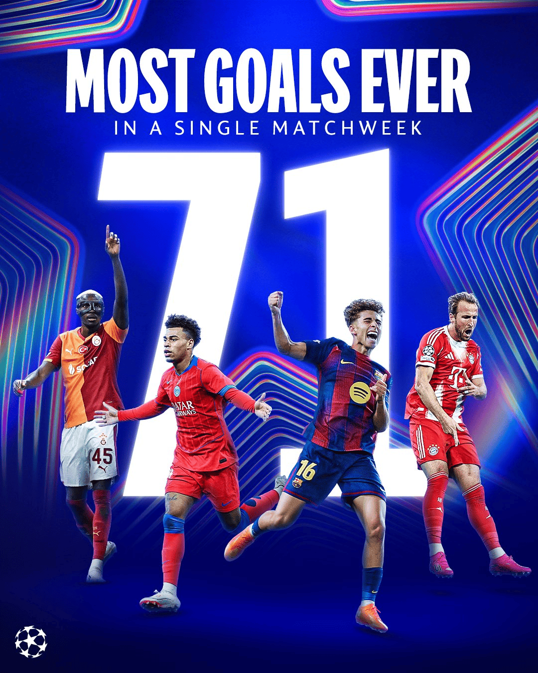虎扑10月23日讯 欧冠联赛阶段第三轮今天凌晨落下帷幕。在18场比赛中,36支球队共打入71球,创造欧冠历史单轮进球最多纪录。