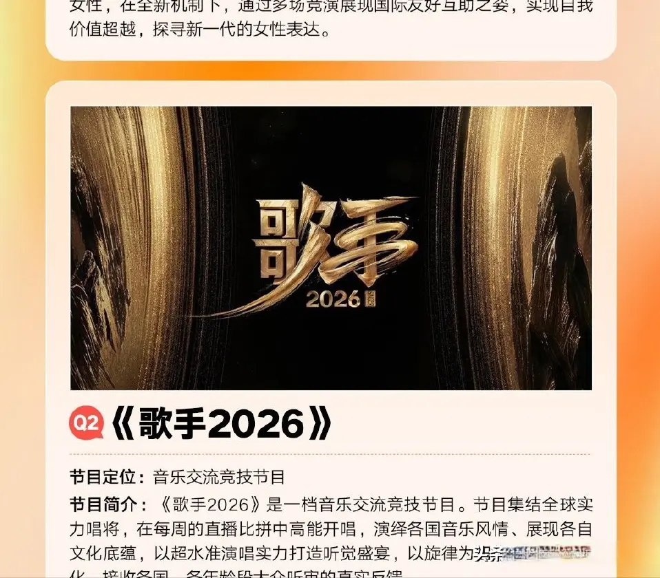 芒果招商会曝光了2026年的综艺布局,其中浪姐、披哥、歌手芒果三大王牌音综都聚集在第二季度,想想看第二季度得多忙。